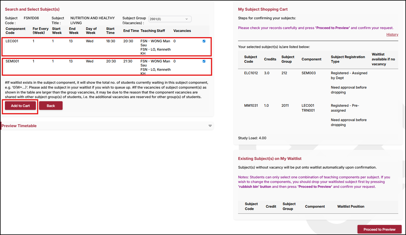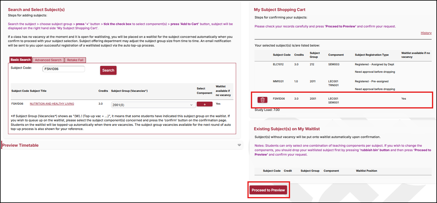 3: Check your subject selection(s) in ‘My Subject Shopping Cart’, repeat Steps