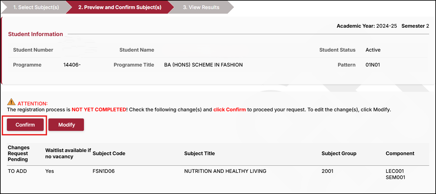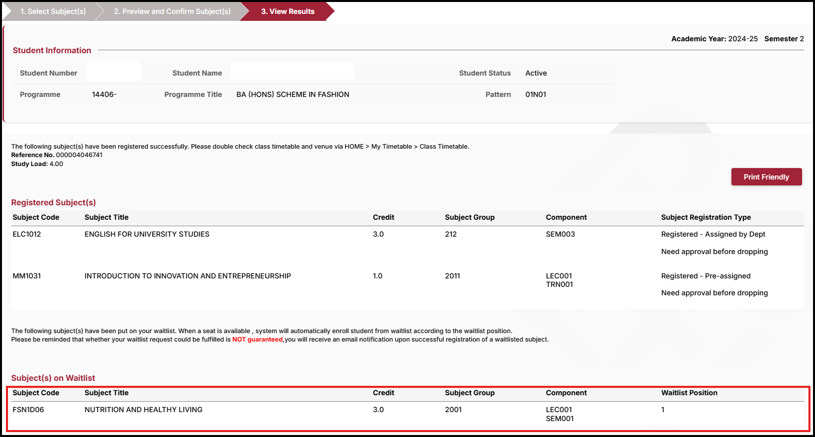 During the Subject Registration Period, the Adjustment before Semester Commencement Period and the Add/Drop Period, you can select subject(s) which you intend to take. When a class enrolment is full and it is available for waitlisting (as indicated by the ‘Waitlist available if no vacancy’ column as shown below in Step 1), you will be placed on a waitlist for the subject concerned automatically when you confirm to proceed with your subject selection. The detailed steps are as follows: